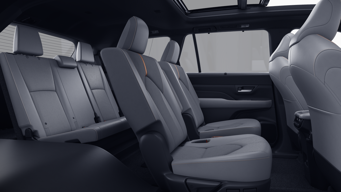 • 7-passenger seating with second-row fold-down captain's chairs and fold-down inboard armrests, adjustable headrests and two cup holders mounted on the floor; and 60/40 split, fold-down third-row seats with sliding headrests and recline function